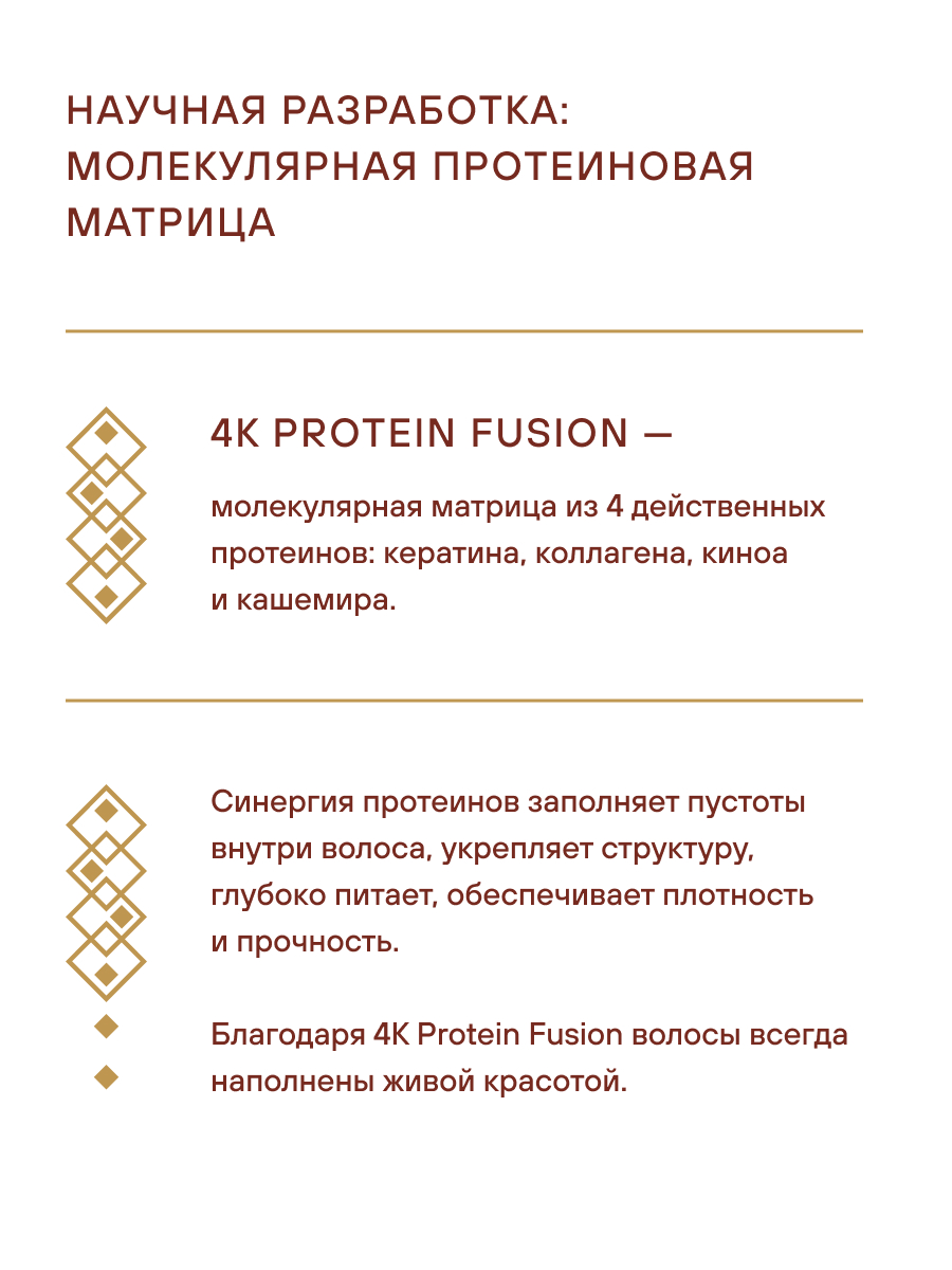 4K Protein Fusion — молекулярная матрица из 4-х действенных протеинов: кератина, коллагена, киноа и кашемира заполняет пустоты внутри волоса, питая и обеспечивая плотность и силу, создавая совершенство.